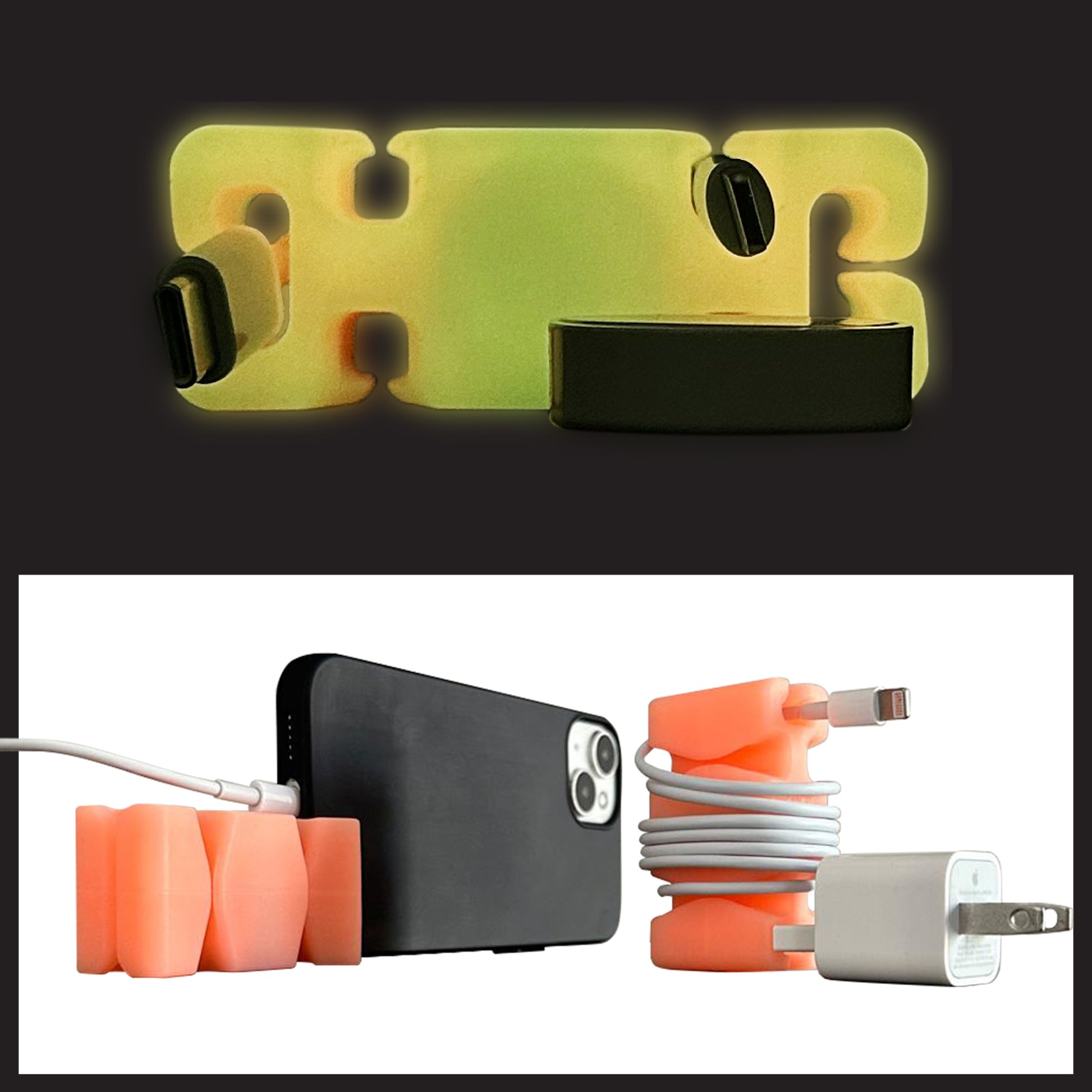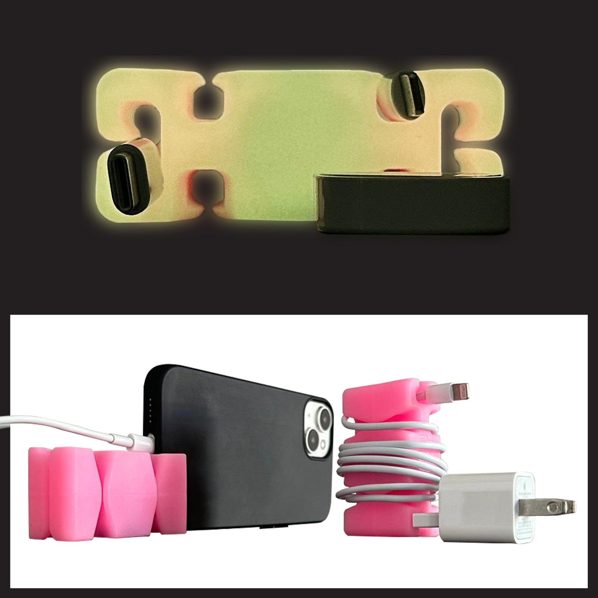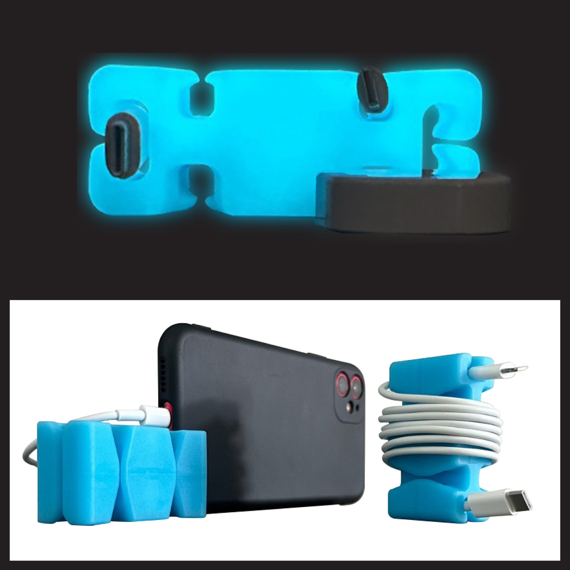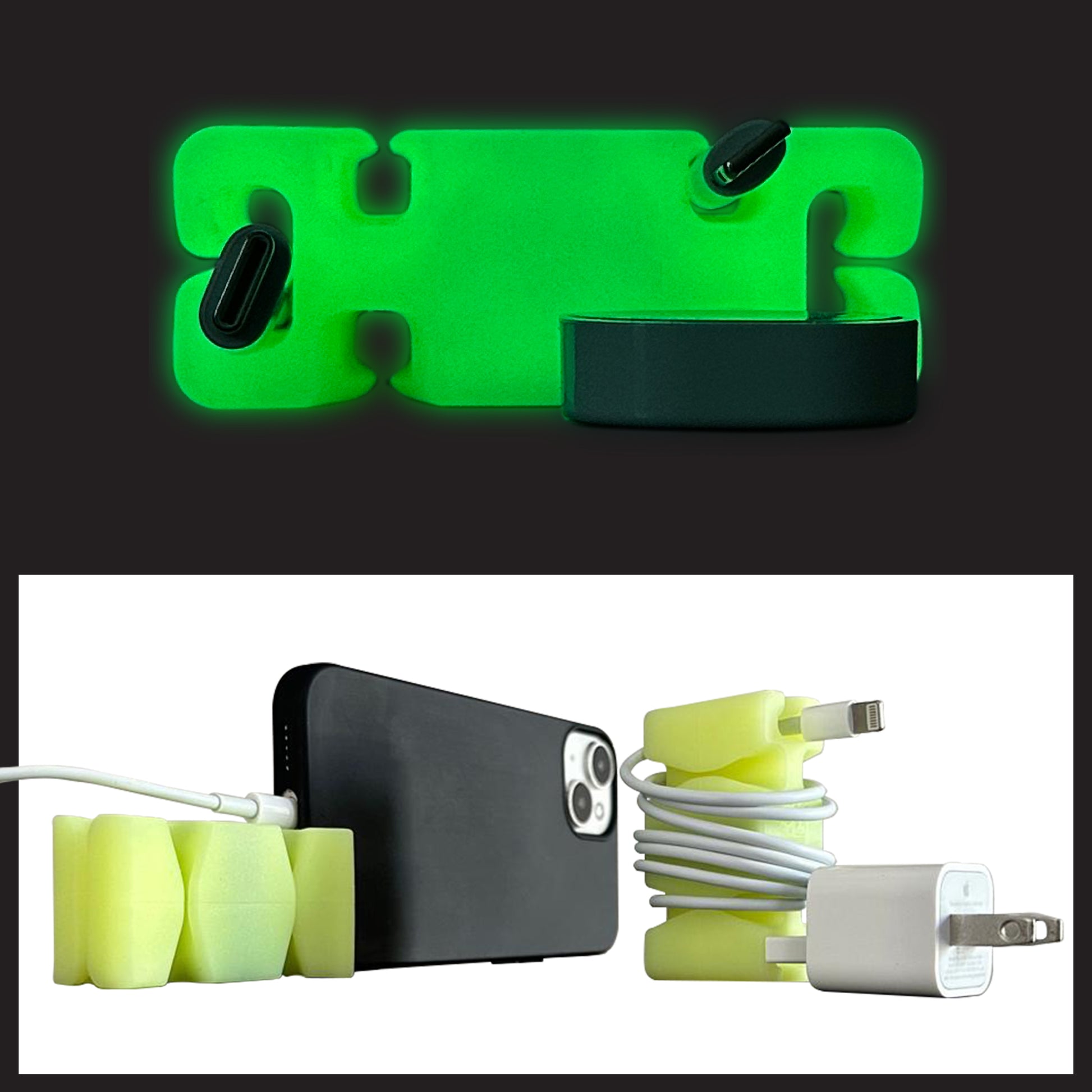 Our Award-Winning, US Patented Weighted Cord Holder, CordBrick, is now available in four vibrant, glow-in-the-dark colors! Still 3.5 oz, it'll keeps your phone charger in place on your nightstand (no more midnight cord fumbles) and will even wraps cords for travel with a quick “snap, wrap, trap.” By day, it’s a sleek silicone gripper in green, yellow, orange, or pink. By night, it lights up so you can spot your cords in the dark - or just enjoy the vibe. Doubling as a phone stand, fitting AirPods, and made of that same flexy silicone customers love, CordBrick GLOW won't disappoint - and is sure to brighten up your routine—or your next gift list!